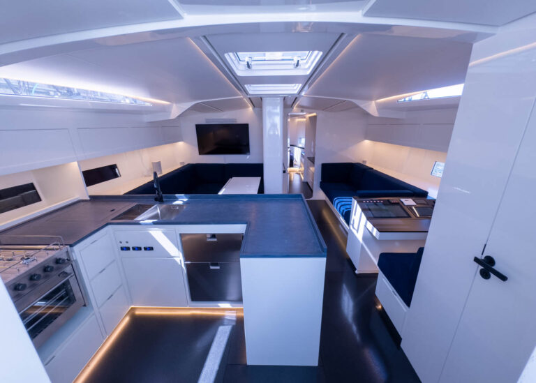 Das Interior besticht durch klare Linien, einen großzügigen Salon, eine luxuriöse Eignerkabine mit En-Suite Badezimmer und zwei sensationellen großzügigen Achterkabinen.